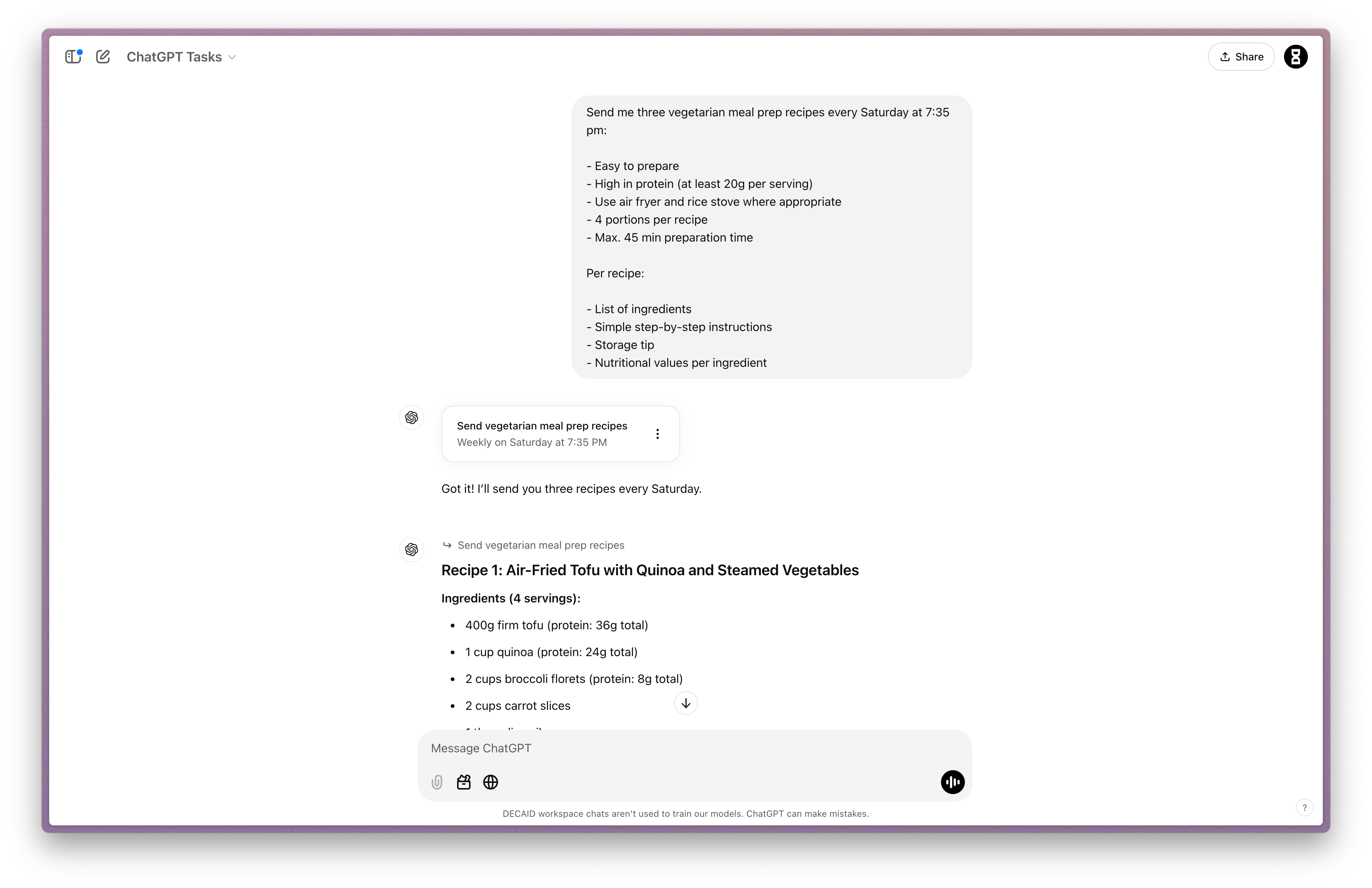 Let's walk through creating a practical task that many of us could use: getting weekly meal prep recipes. Here's exactly how to set it up: